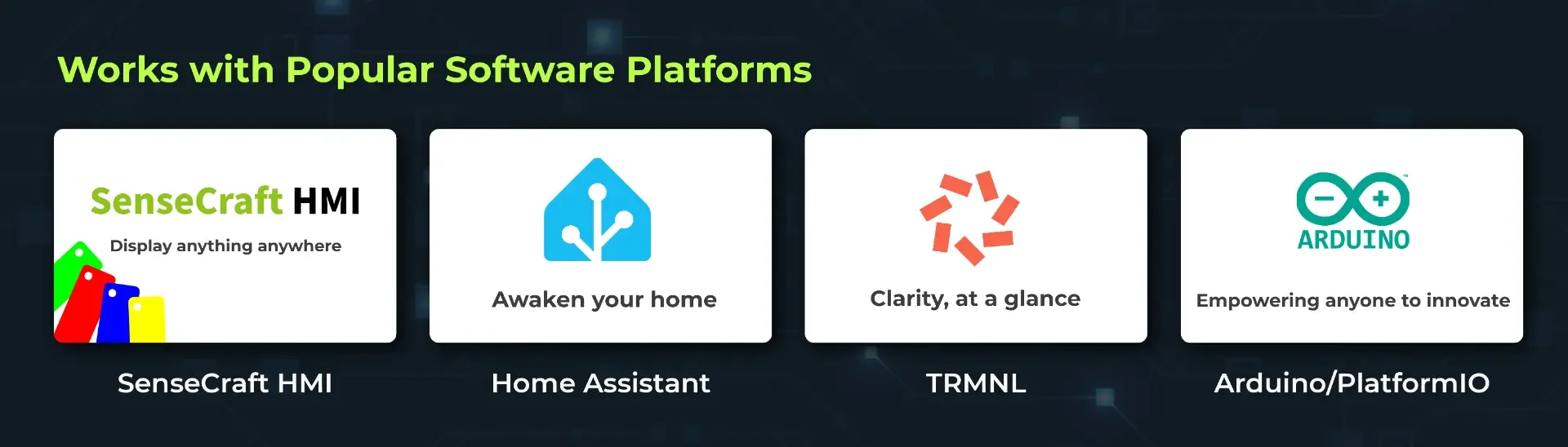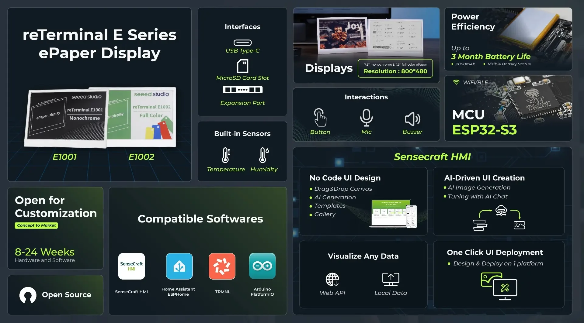 Enjoy seamless compatibility with multiple software ecosystems. Create no-code TRMNL Dashboards with 300+ plugins for everyday and work data, connect instantly to Home Assistant via ESPHome firmware, or developing your customized applications using Arduino, PlatformIO or ESP32-IDF environment.