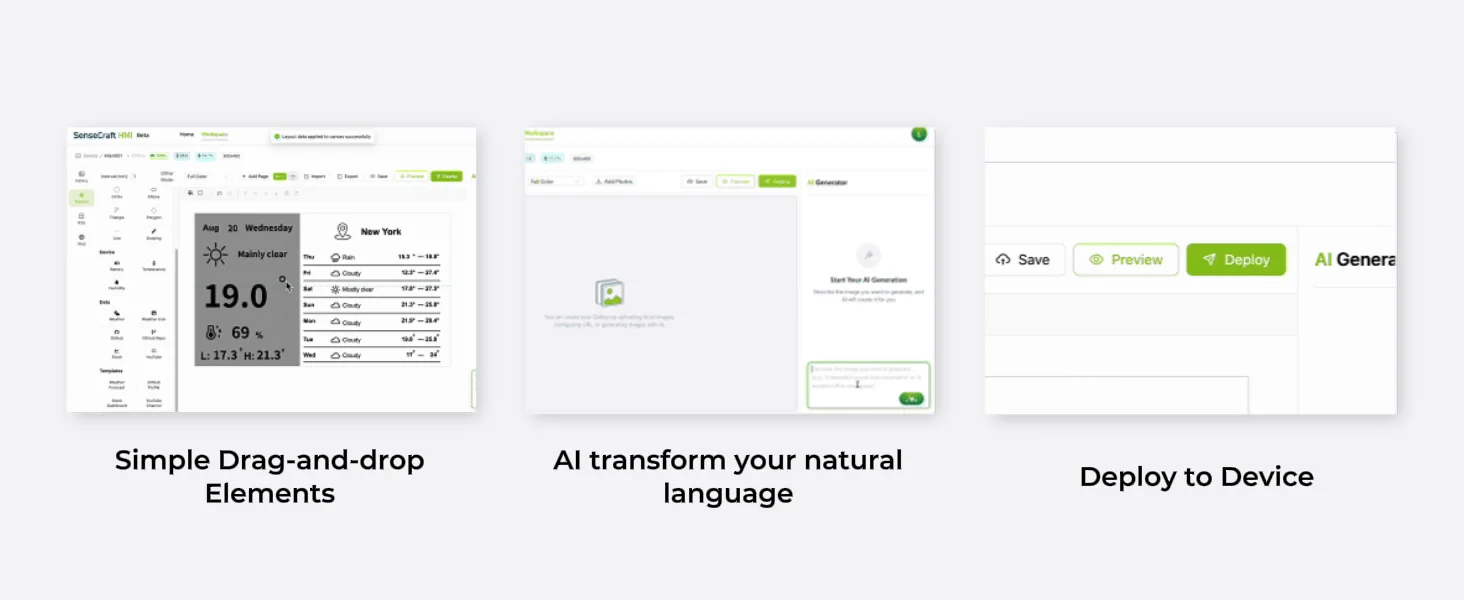 Design and deploy personalized dashboards effortlessly with SenseCraft HMI, our new AI-powered no-code platform. Create your UI through simple drag-and-drop elements, choose from our rich templates, or let AI help you. Connect real-time data from onboard sensors or web APIs, then deploy your finished dashboard to reTerminal E1001/E1002 display with just a few clicks. From design to data configuration to deployment, everything happens seamlessly on one single platform.