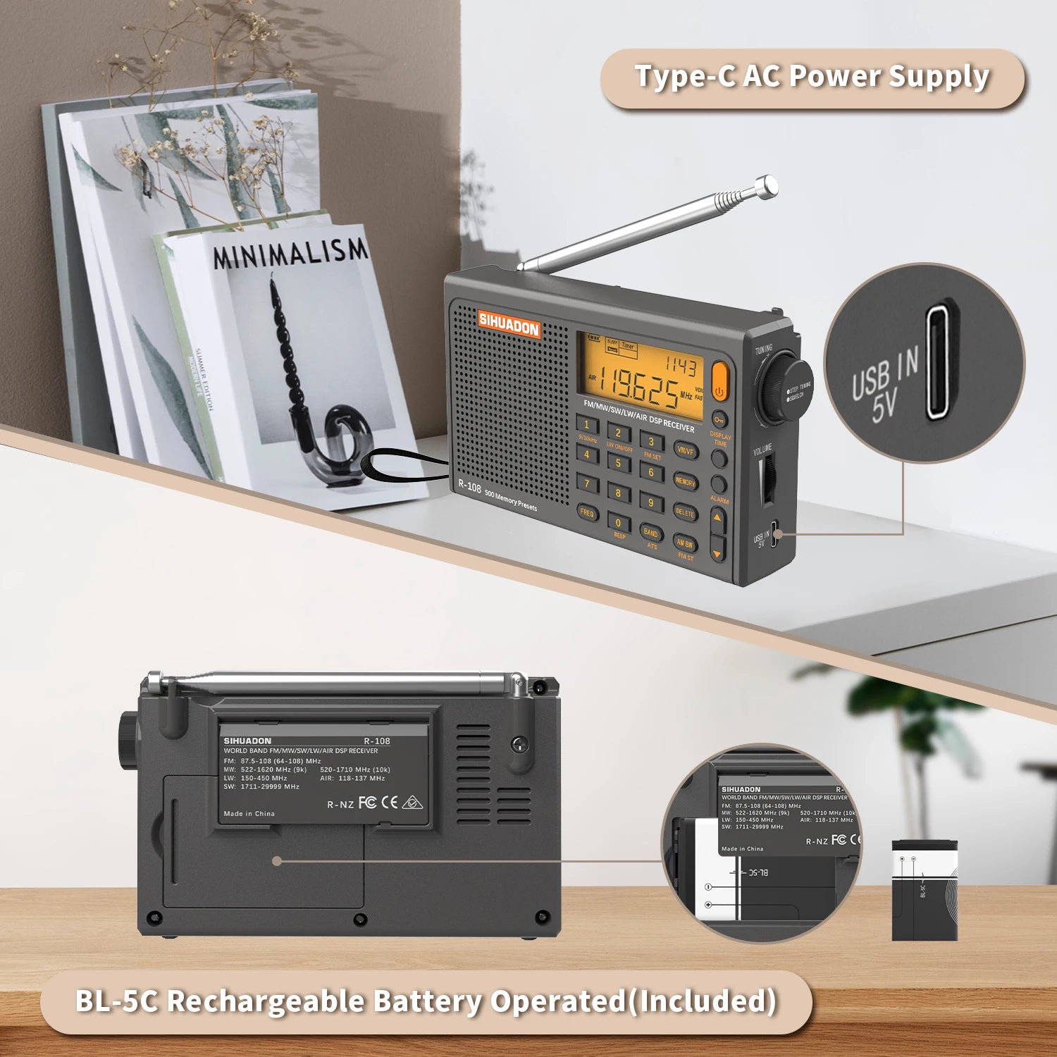 SIHUADON R-108 Mini Radio FM AM SW MW LW AIR Full Bands Stereo Radio Digital Portable Radio Receiver Battery Radio SIHUADON R108